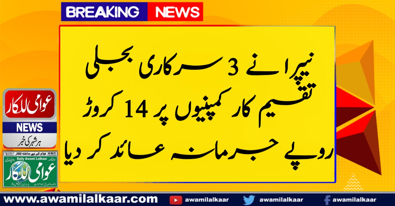 نیشنل الیکٹرک پاور ریگولیٹری اتھارٹی (نیپرا) نے 3 سرکاری بجلی تقسیم کار کمپنیوں پر مجموعی طورپر 14کروڑ روپے کا جرمانہ عائدکردیا