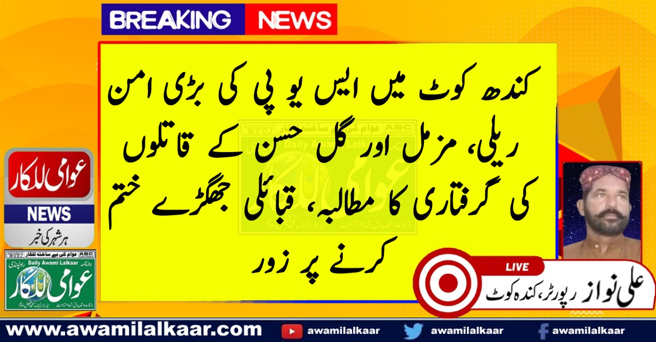 کندھ کوٹ (علی نواز شیخ)کندھ کوٹ میں ایس یو پی کی جانب سے امن اور عوامی تحفظ کے حق میں بڑی ریلی نکالی گئی، جس میں علاقے میں بڑھتی ہوئی بدامنی، قبائلی جھگڑوں اور قتل و غارت کے واقعات کے خلاف شدید احتجاج کیا گیا۔ مظاہرین نے مطالبہ کیا کہ مزمل اور گل حسن کے قاتلوں کو فوری طور پر گرفتار کیا جائے اور علاقے میں پائیدار امن قائم کرنے کے اقدامات کیے جائیں۔ریلی کا آغاز ایس یو پی ہاؤس سے ہوا اور لائبریری چوک تک جاری رہی۔
